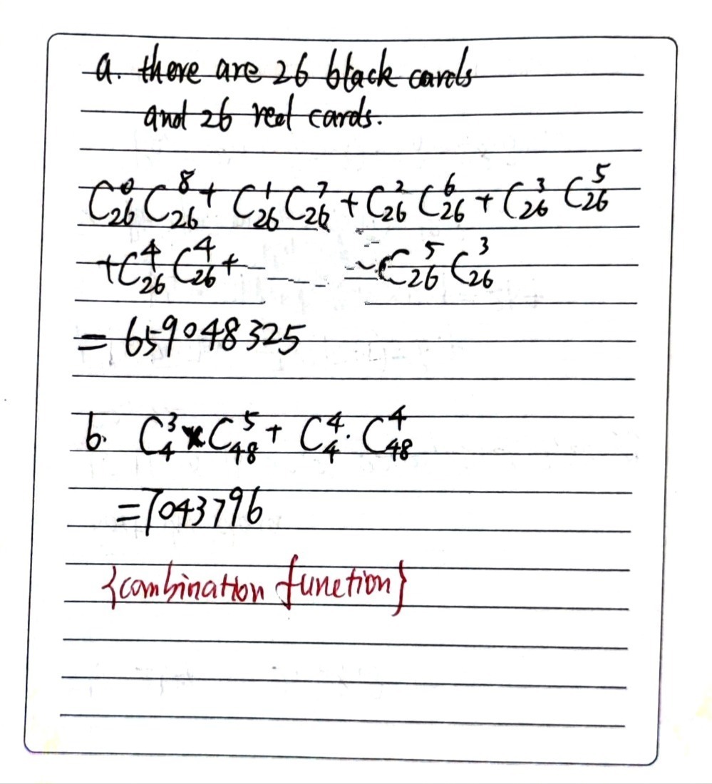 By the wording of the question, i've assumed that the color of the 5 cards to be chosen is not predetermined. A standard pack of playing cards contains 26 red cards and 26 black cards. I am looking for just the colors. Similarly, there is the same number of queens as there are kings in a deck of cards. 52 × 1 2 = 52 2 = 26 black cards. Assuming that you mean a standard deck of playing cards (if you don't, the question is unanswerable). Number of jacks in cards. Feb 12, 2021 · number of queens in a deck of cards. The first card we choose can be any of the 52 cards. And, that makes 4 kings in a deck of cards. How many ace in a deck? This is because there are two black suits, the spades and the clubs. The jacks, queens, and kings are all considered face cards.